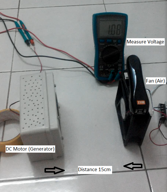While waiting for delivery my order DC booster, i have do testing distance generator between brushless fan to see the output voltage on Mini DC Motor.